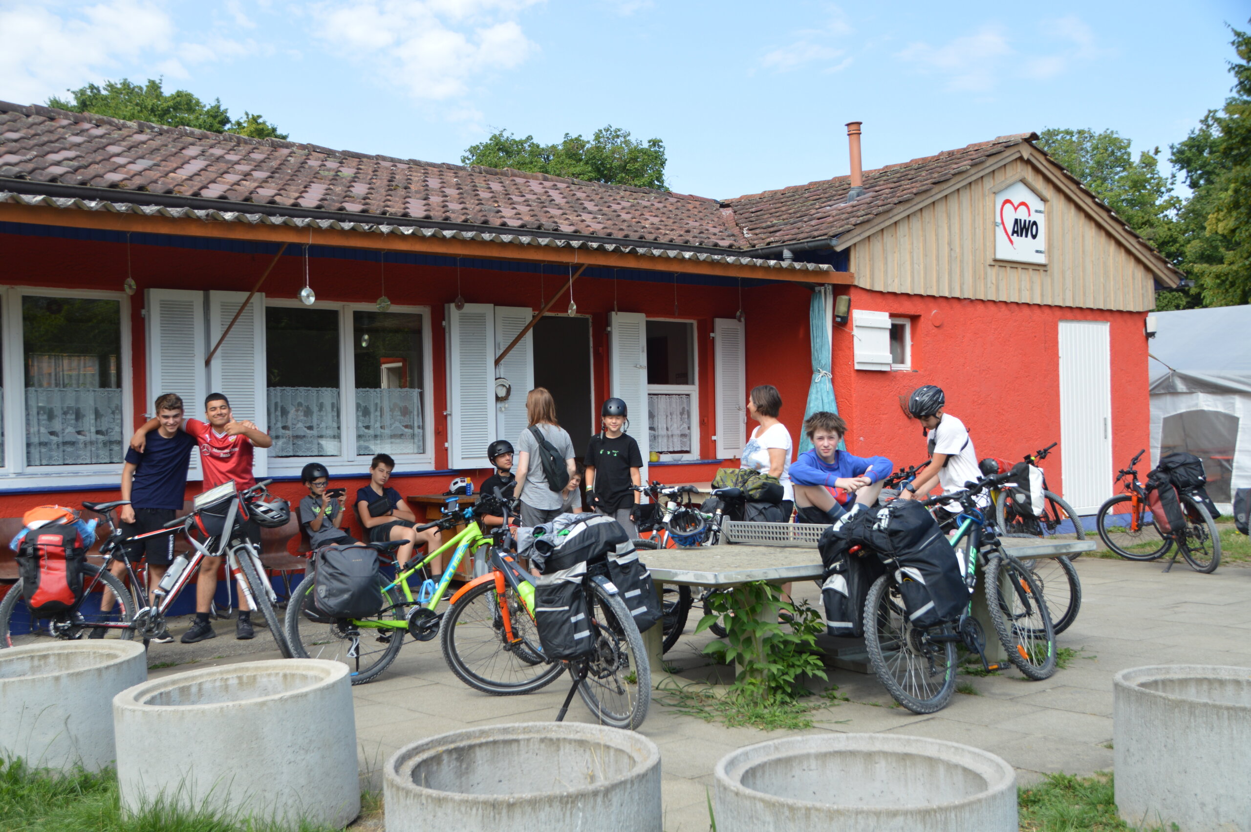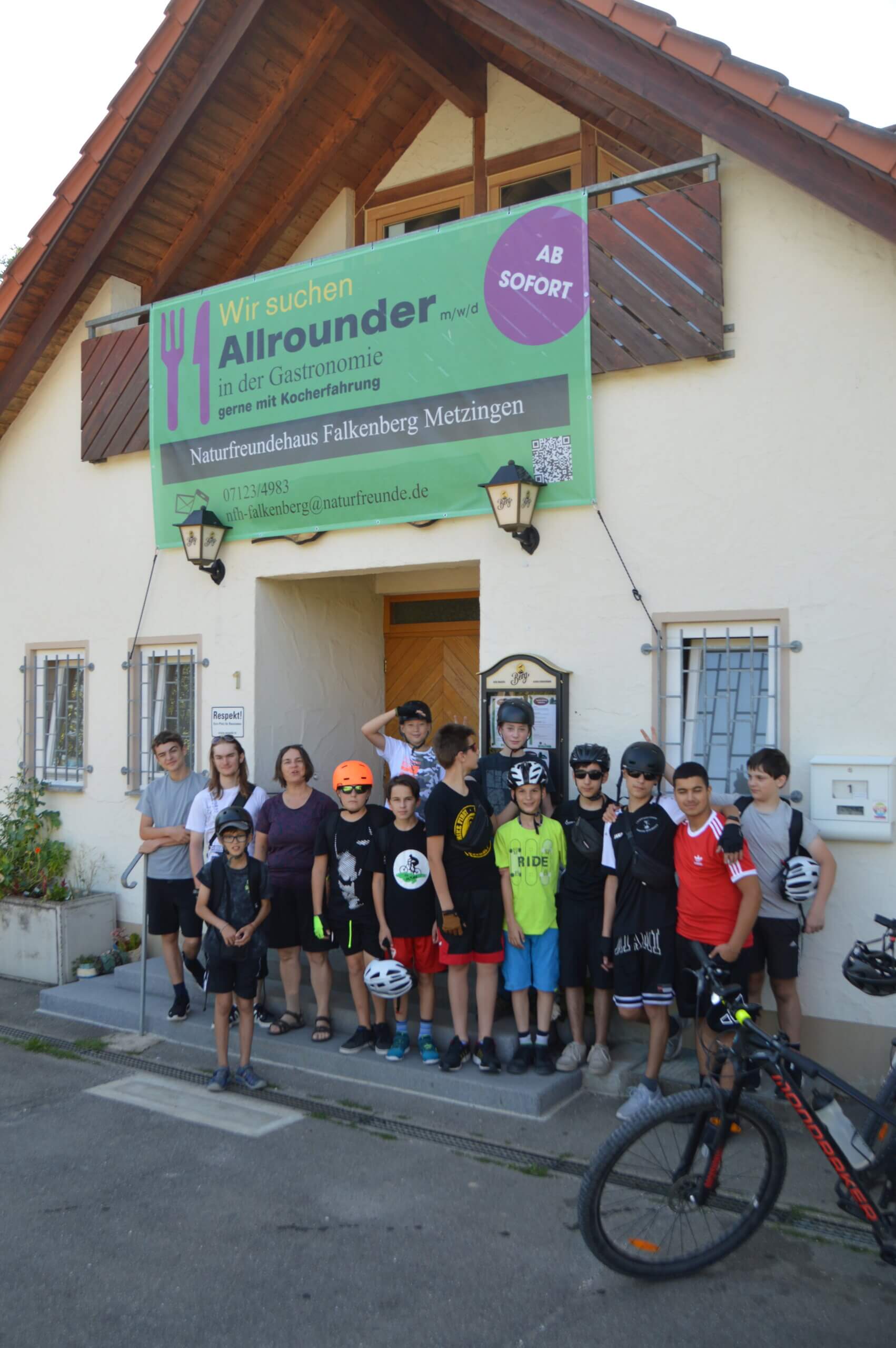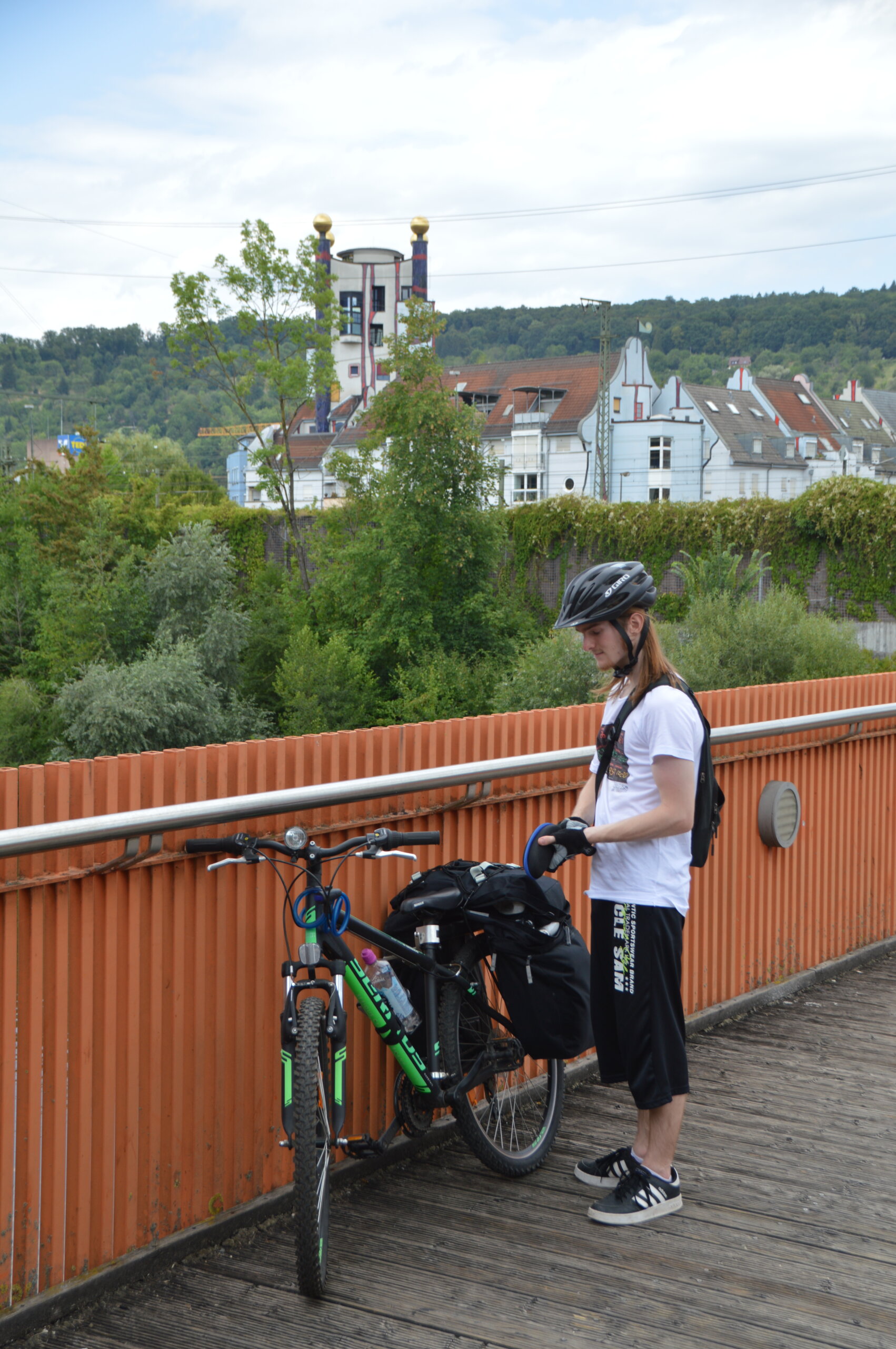 Montag, 17. Juli 2023: Hoch motiviert und bereit für das große Abenteuer trafen wir uns um 7. 45 Uhr an der Schule, um per Rad zum Bodensee aufzubrechen. Über Mühlhausen erreichten wir bald das Neckartal und machten bei Plochingen unsere erste große Pause. Hier die Neckarbrücke mit Blick auf das Hundertwasserhaus in Plochingen. Und weiter gings im Neckartal über Nürtingen – eine willkommene Abkühlung und ein Fußbad inbegriffen nach Metzingen in das Naturfreundehaus Falkenberg, unserer ersten Übernachtung. Hier wurden wir von Frau Schreiber herzlich empfangen, bezogen unsere Zimmer und machten gleich mal Feuer, um unsere Würstchen zu grillen und die leckeren Salate zu essen. Das Haus liegt oberhalb von Metzingen mit toller Aussicht ins Ermstal.