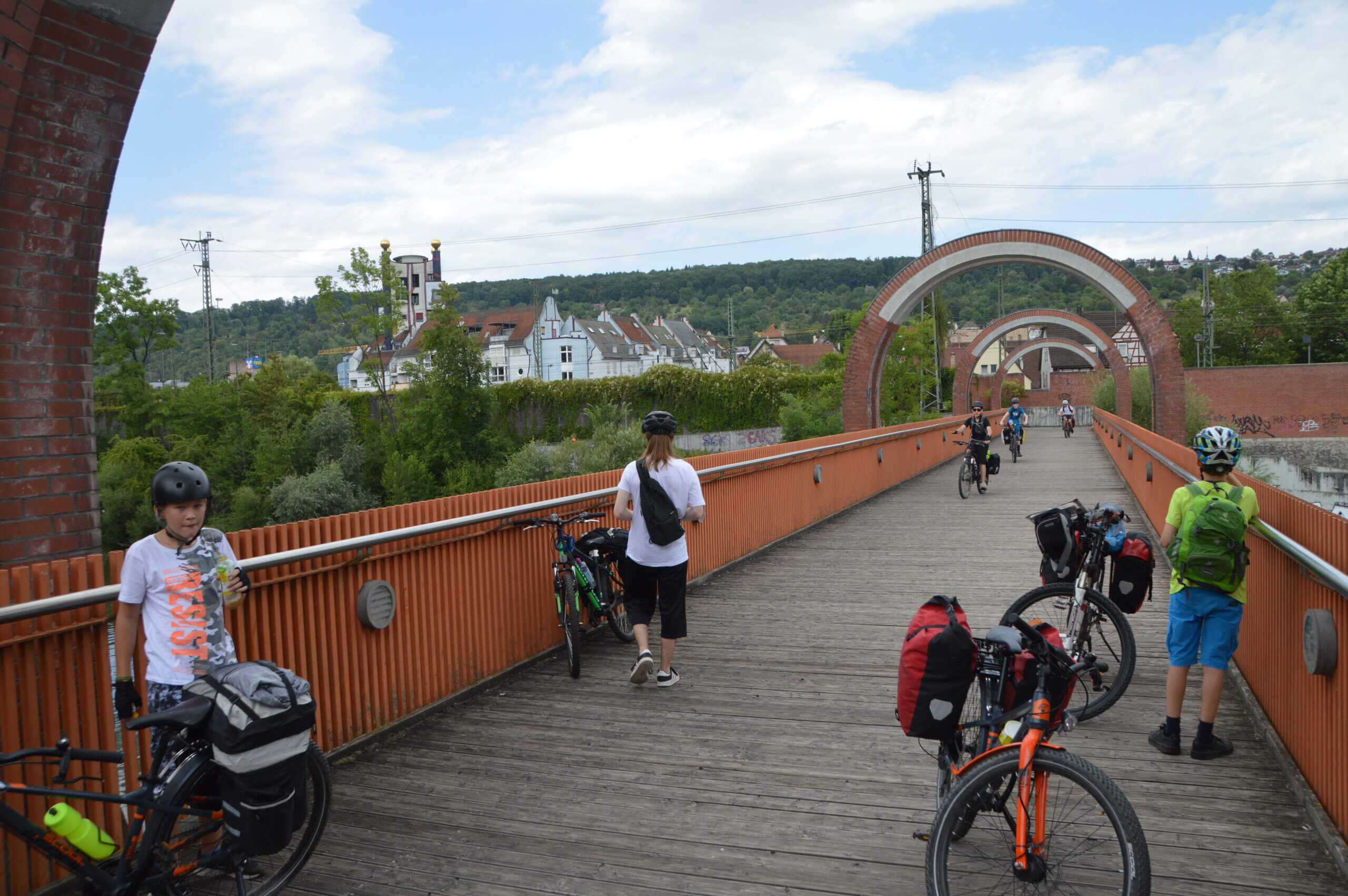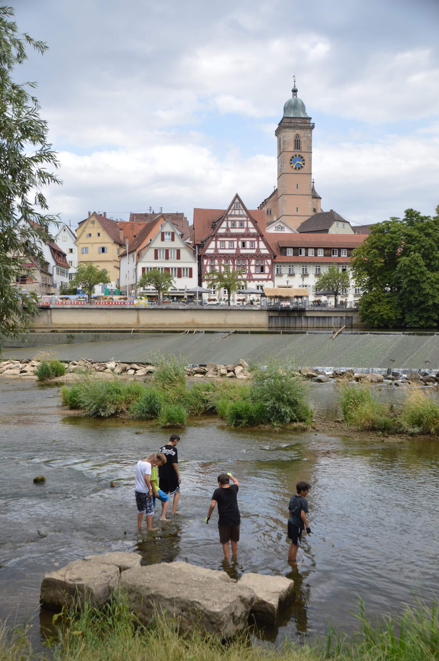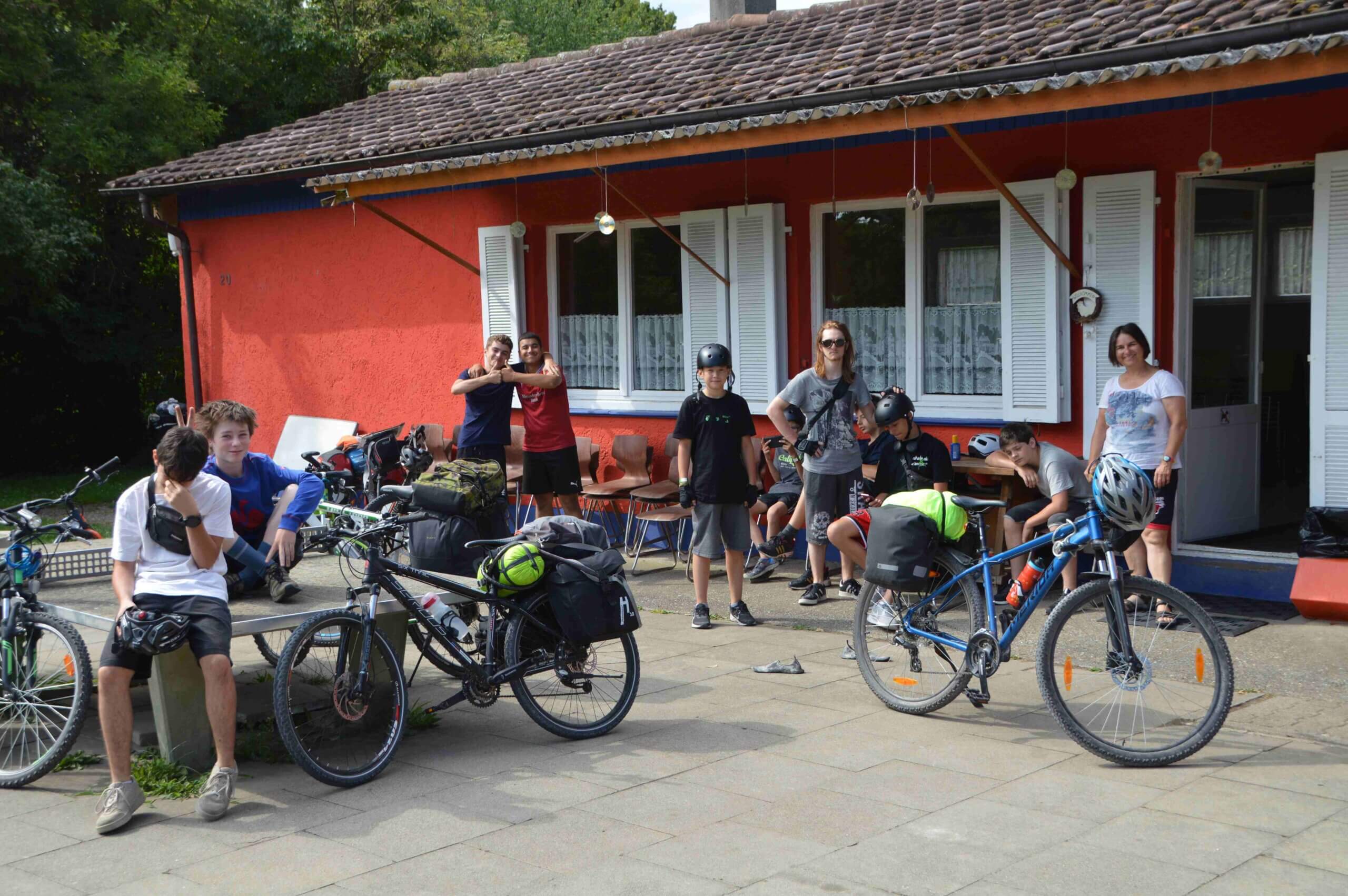 Montag, 17. Juli 2023: Hoch motiviert und bereit für das große Abenteuer trafen wir uns um 7. 45 Uhr an der Schule, um per Rad zum Bodensee aufzubrechen. Über Mühlhausen erreichten wir bald das Neckartal und machten bei Plochingen unsere erste große Pause. Hier die Neckarbrücke mit Blick auf das Hundertwasserhaus in Plochingen. Und weiter gings im Neckartal über Nürtingen – eine willkommene Abkühlung und ein Fußbad inbegriffen nach Metzingen in das Naturfreundehaus Falkenberg, unserer ersten Übernachtung. Hier wurden wir von Frau Schreiber herzlich empfangen, bezogen unsere Zimmer und machten gleich mal Feuer, um unsere Würstchen zu grillen und die leckeren Salate zu essen. Das Haus liegt oberhalb von Metzingen mit toller Aussicht ins Ermstal.
