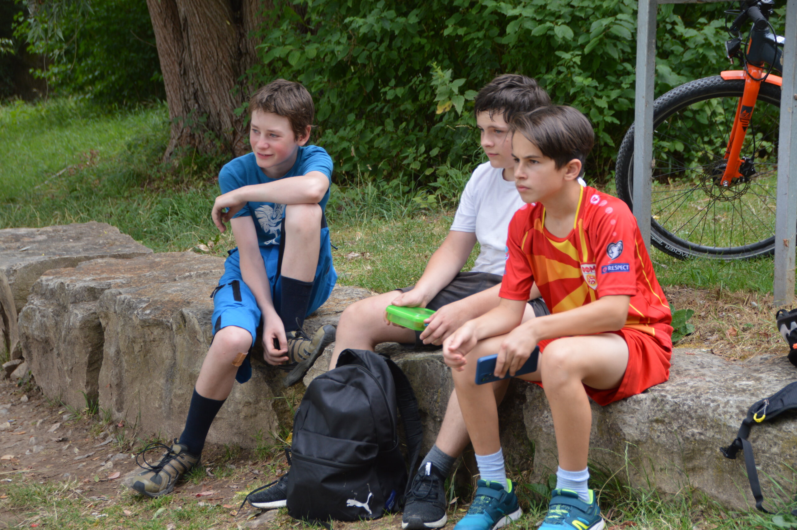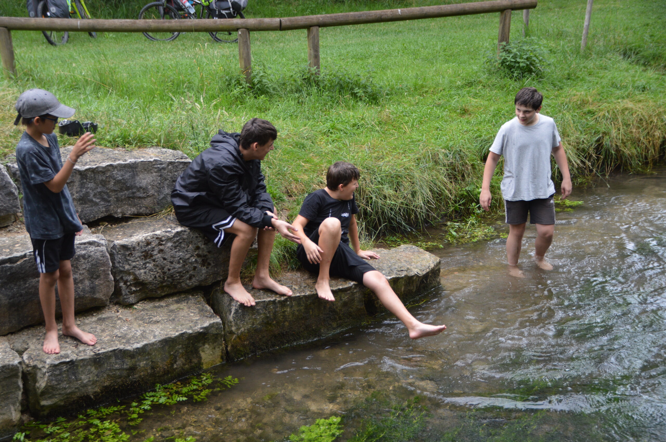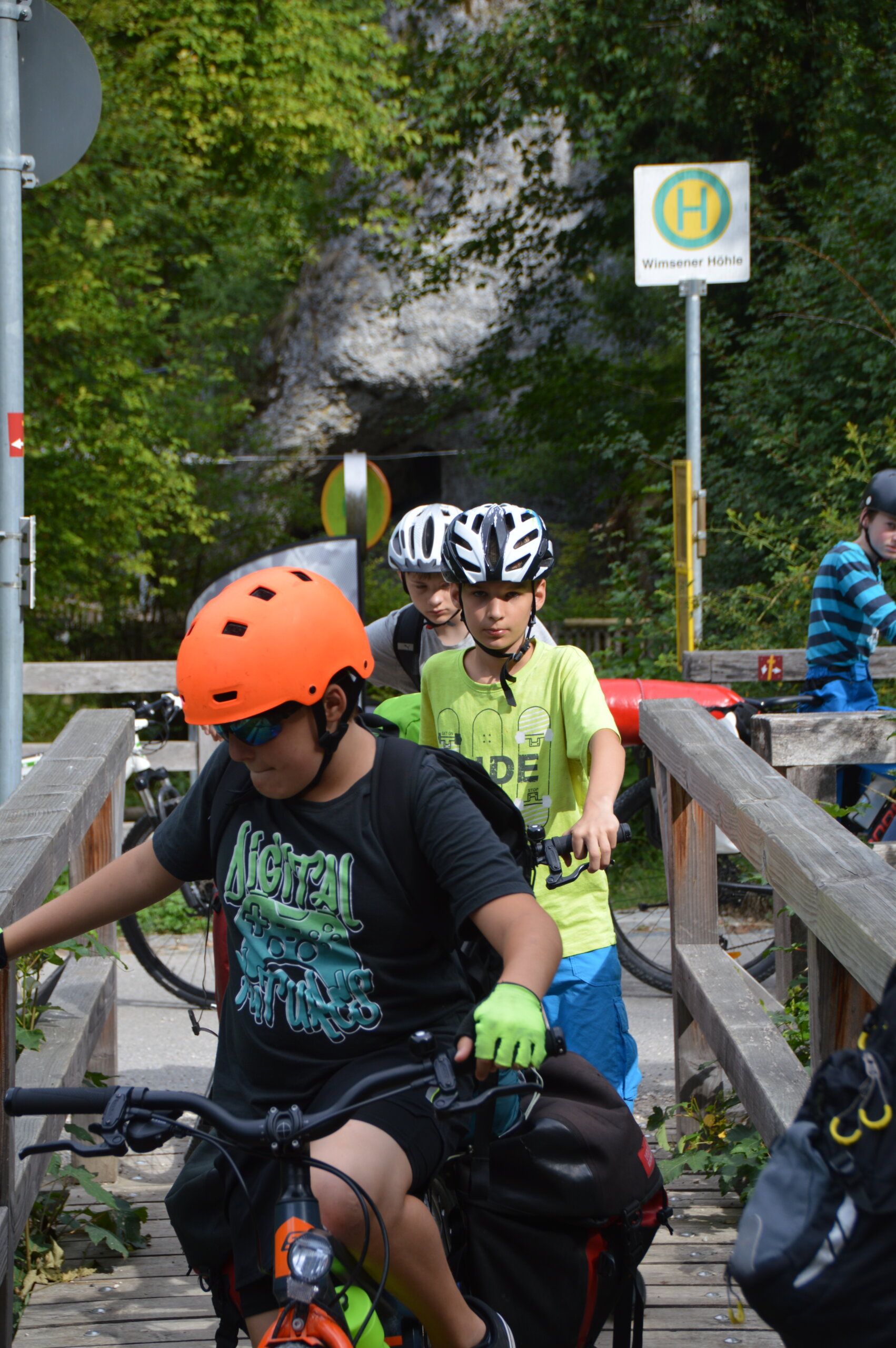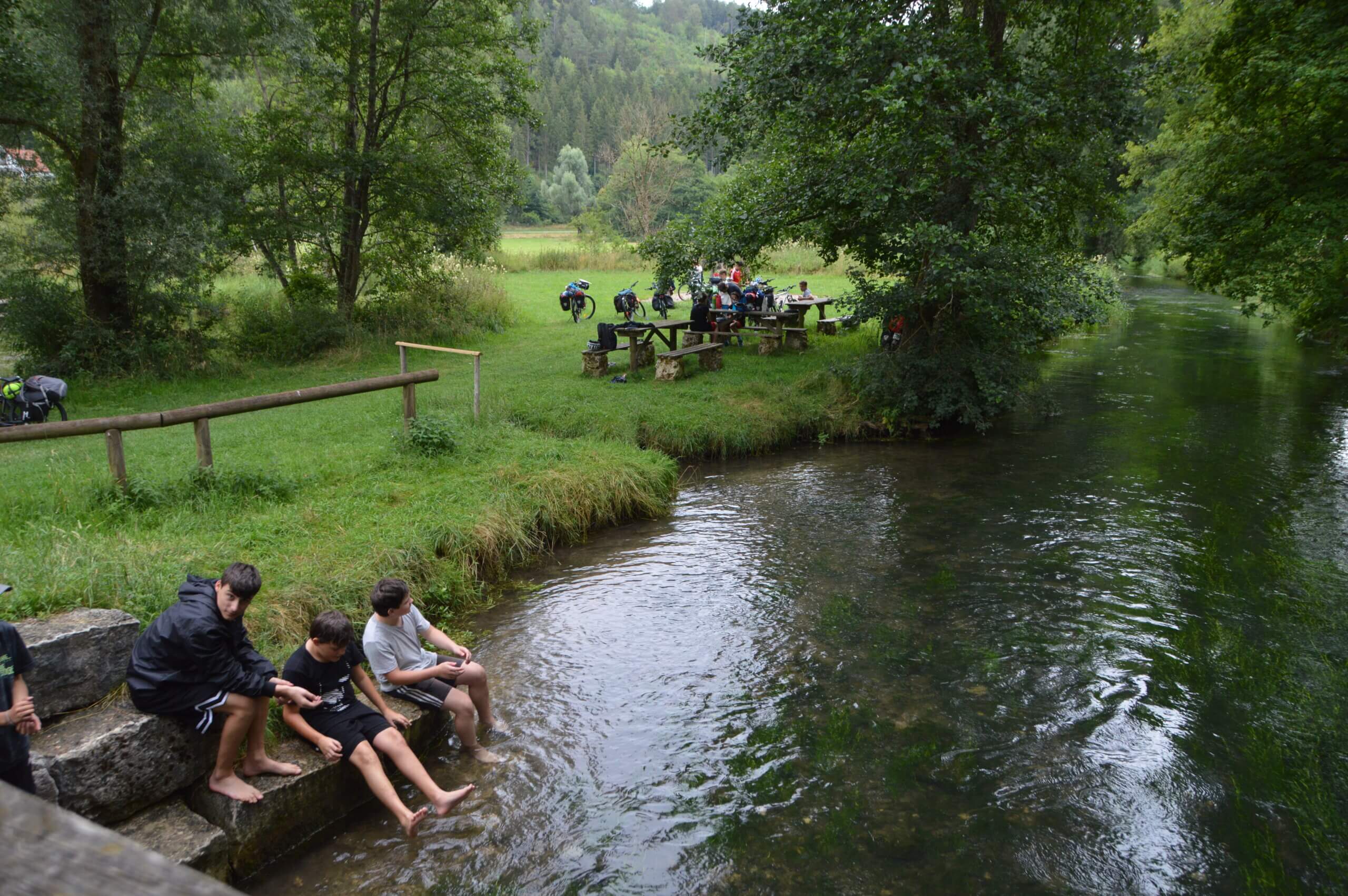 Mittwoch, 19. Juli 2023: Mit jetzt bereits 150 km in den Beinen starteten wir von Hayingen Richtung Zwiefalten, schauten uns die Wimsemer Wasserhöhle an und erreichten gegen Mittag das Donautal. Heute war es sehr heiß und wir hatten eine lange Etappe vor uns. Das Donautal zog sich dahin und gegen 17.00 Uhr erreichten wir endlich Sigmaringen. Hier kauften wir für das Abendessen ein und starteten zum letzten Teilstück im oberen Donautal mit tollen Blicken auf die Felsen am Rand des Tales. Endlich kamen wir im Talhof an, in dem wir den Abend und die Nacht verbrachten. Unser Chefkoch Deniz zauberte leckeren Thai Curry mit Reis. Das obere Donautal ist wirklich sehr abgelegen und so gab es kein Wlan und nicht immer Handynetz – für manche ein Riesenproblem. Die echten Probleme kamen dann aber in der Nacht: Drei Jungs mussten mehrfach spucken und ihnen ging es auch am nächsten Morgen nicht besser, so dass sie von ihren Eltern abgeholt werden mussten. Schade, so kurz vor dem Ziel!