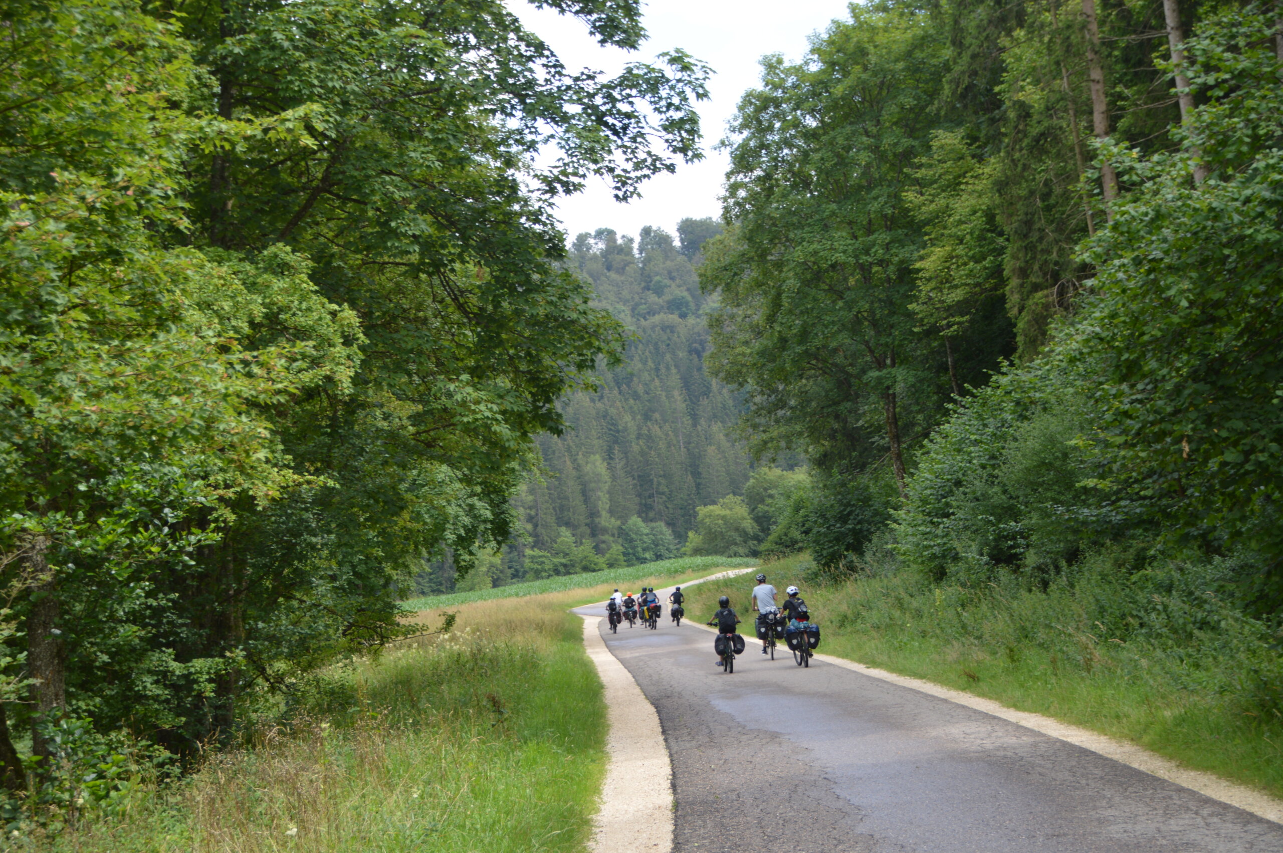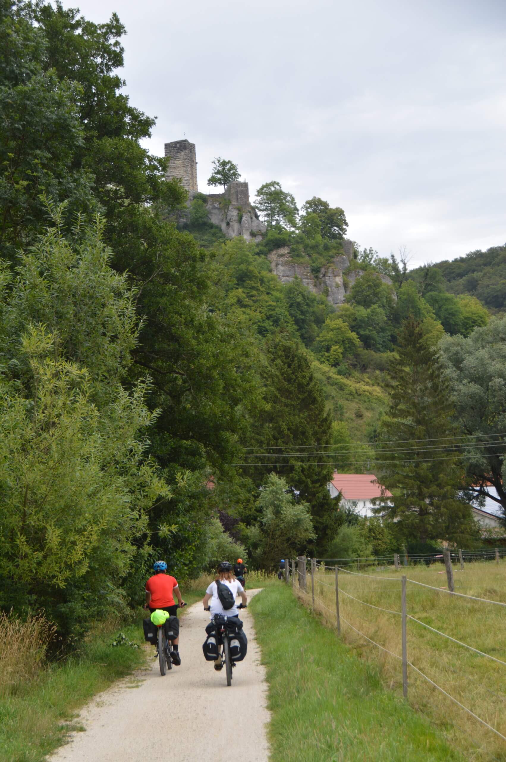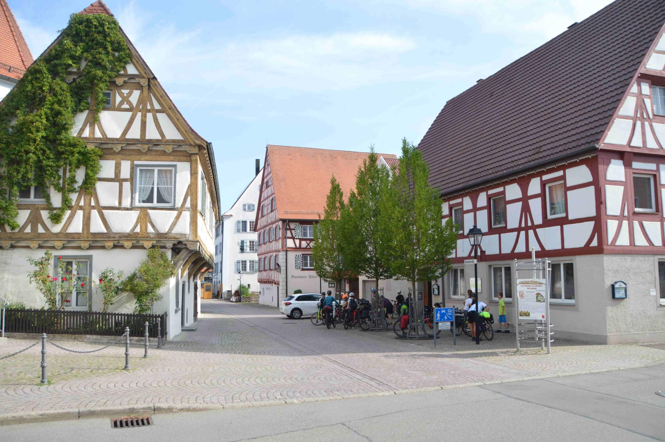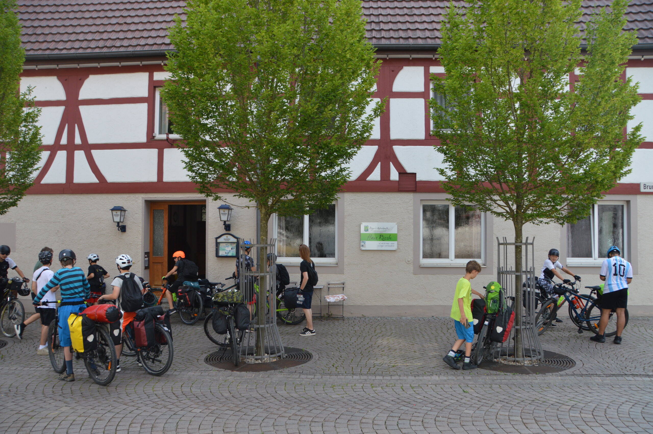 Dienstag, 18. Juli 2023: Nach einer ruhigen Nacht und noch etwas müde brachte uns Frau Schreiber frische Brötchen und wir frühstückten und schmierten Brote für den Tag. Gleich ging es über die Weinberge wieder abwärts in Ermstal nach Bad Urach. Hier begann unsere erste Bergetappe durch den Wald immer im Ermstal entlang rund 300 Höhenmeter aufwärts bis Münsingen. Zur Erfrischung setzte leichter Regen ein und wir fuhren eine Mega-Abfahrt hinunter in das wunderschöne Lautertal, wo wir bei Buttenhausen unsere zweite große Vesperpause einlegten. Immer im Lautertal entlang ging es bis zur Bergankunft in Hayingen. Hier übernachteten wir mitten im Dorf im Rössle. Abends gab es Spaghetti mit Veggie-Hack Tomatensoße und Salat.