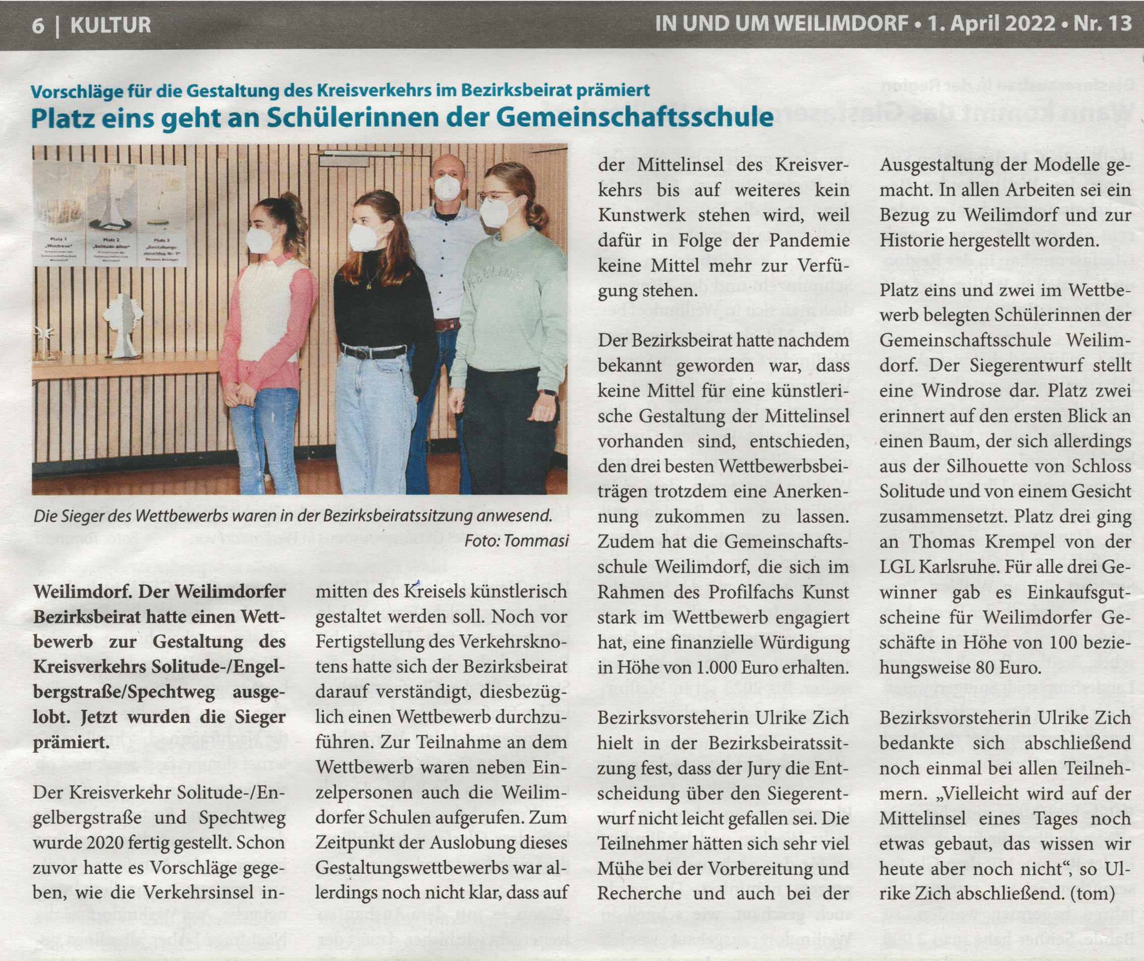 SchĂĽlerinnen der GMSW gewinnen Gestaltungswettbewerb eines Kreisverkehrs Bei einem Wettbewerb zur kĂĽnstlerischen Gestaltung eines belebten Verkehrsknotens in Stuttgart-Weilimdorf sind drei SchĂĽlerinnen der [...]
